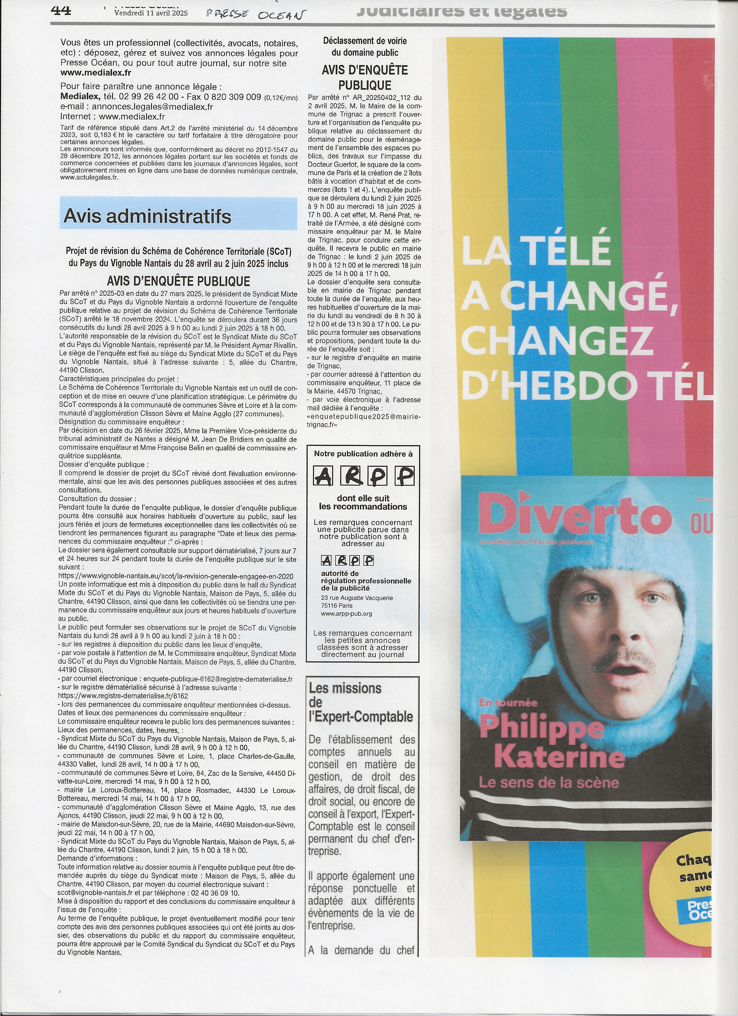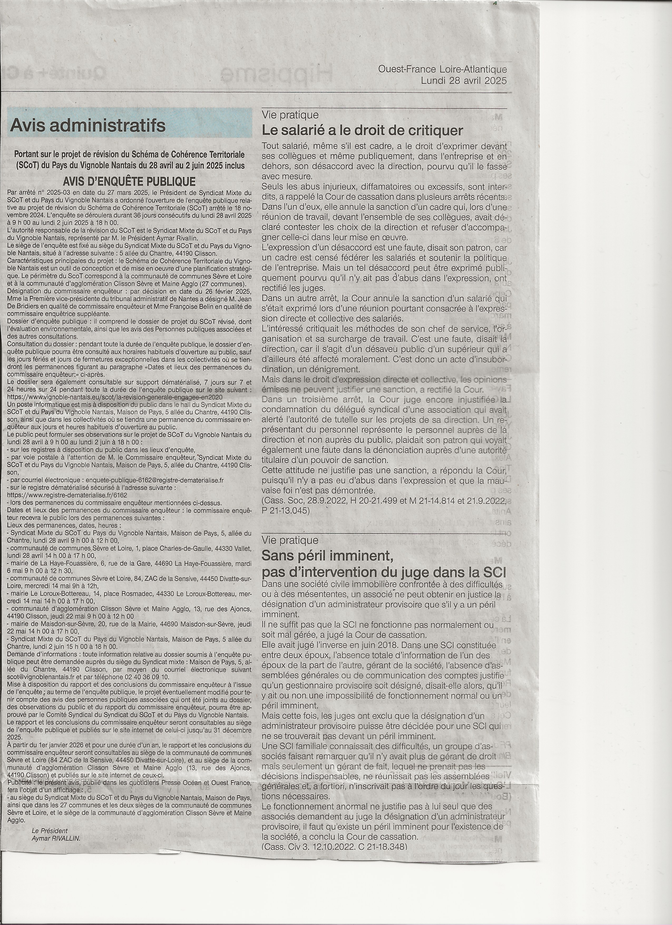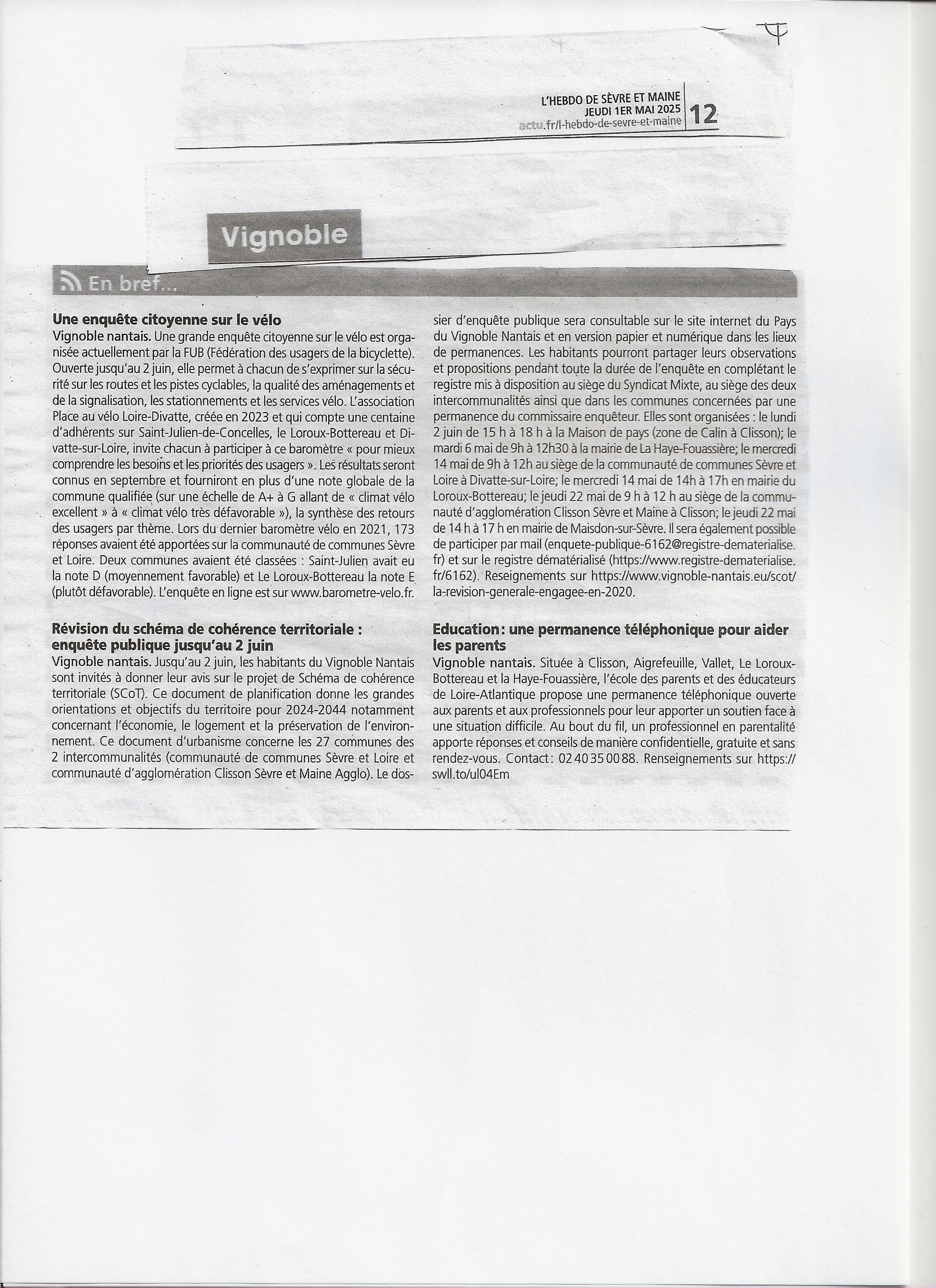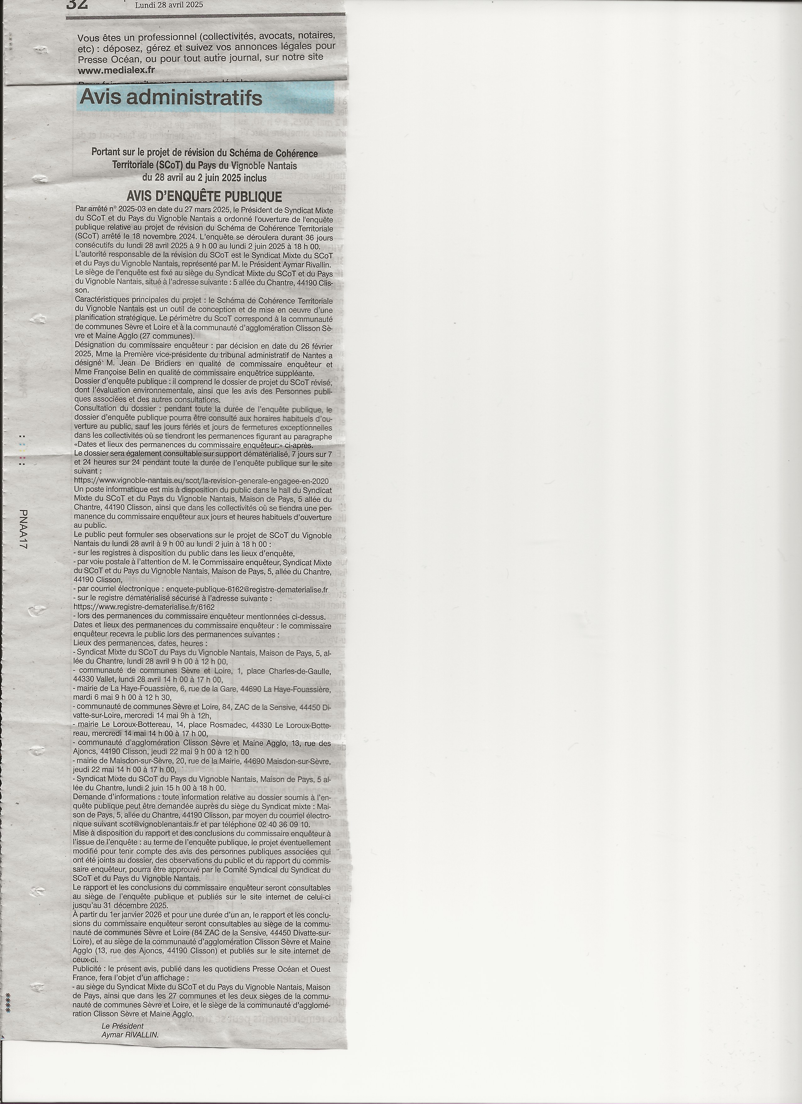 A partir du 1er janvier 2026 et pour une durée d’un an, le rapport et les conclusions du commissaire enquêteur seront consultables au siège de la Communauté de communes Sèvre et Loire (84 ZAC de la Sensive, 44450 DIVATTE-SUR-LOIRE) et au siège de la Communauté d’agglomération Clisson Sèvre et Maine Agglo (13 rue des Ajoncs, 44190 CLISSON) et publiés sur le site internet de ceux-ci.